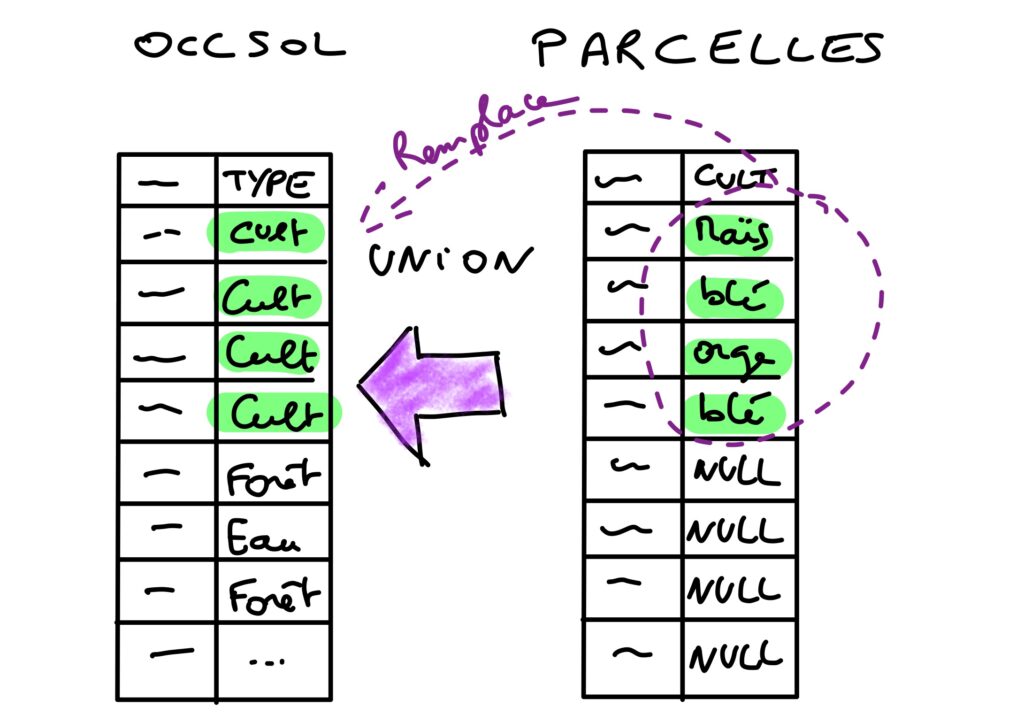 - en colonne : les occupations du sol augmentées des cultures déclarées dans le cadre de la PAC (cf. jeux de données ci-dessous).