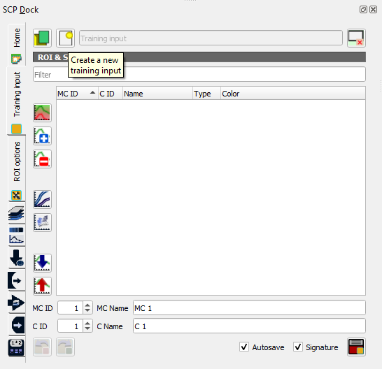 Rendez-vous dans l’onglet Training input (données d’entraînement) de la boîte à outils SCP. Cliquez sur Create a new training input et donnez un nom à la couche qui stockera vos zones d’intérêt.