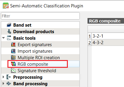 Sous « RGB composite« , cliquez sur le symbole. Une nouvelle ligne apparaîtra dans le tableau. Double-cliquez là où il est actuellement indiqué 0-0-0 et tapez 3-2-1. Répétez le processus et cette fois, tapez 4-3-2.