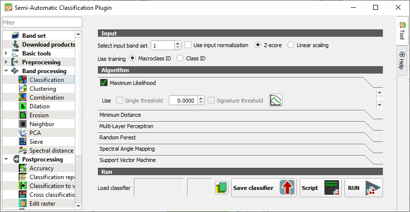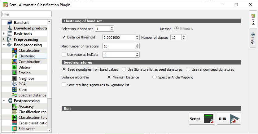 Soit dans le Dock SCP, soit dans la fenêtre SCP ouverte, sélectionnez Band processing. Cliquez sur l’onglet Clustering. Utiliser la méthode ISODATA.