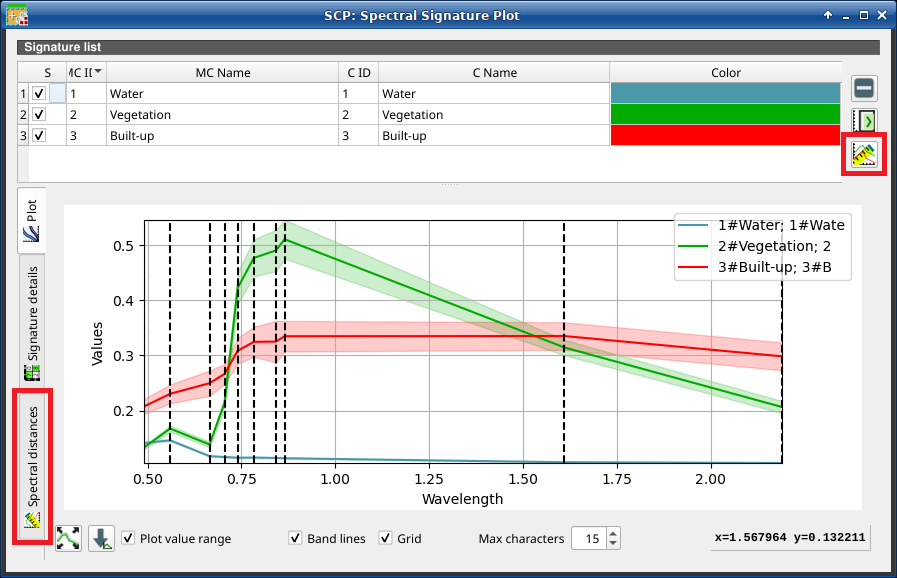 En visualisant les signatures des zones d’entraînement, vous constatez quelles signatures se ressemblent qualitativement. Il existe des indicateurs quantitatifs de « distance spectrale ». Ils permettent d’estimer la facilité que l’algorithme aura à distinguer deux classes.
