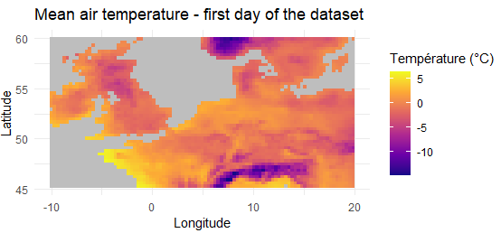 labs(title = "Mean air temperature - first day of the dataset", x = "Longitude", y = "Latitude", fill = "Température (°C)") +